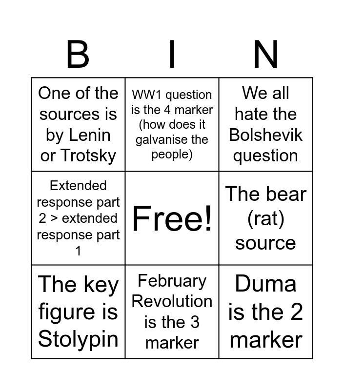This bingo card has a free space and 8 words: The bear (rat) source, We all hate the Bolshevik question, WW1 question is the 4 marker (how does it galvanise the people), The key figure is Stolypin, One of the sources is by Lenin or Trotsky, Duma is the 2 marker, Extended response part 2 > extended response part 1 and February Revolution is the 3 marker.