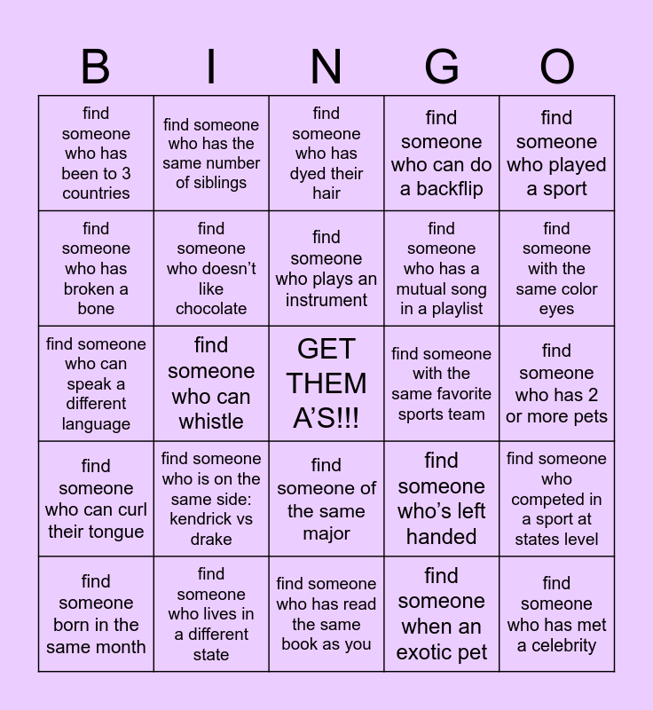 This bingo card has a free space and 26 words: find someone of the same major, find someone when an exotic pet, find someone who plays an instrument, find someone who lives in a different state, find someone who played a sport, find someone who has been to 3 countries, find someone who has broken a bone, find someone who has the same number of siblings, find someone who has 2 or more pets, find someone who’s left handed, find someone who has a mutual song in a playlist, find someone who can speak a different language, find someone who competed in a sport at states level, find someone born in the same month, find someone who can whistle, find someone with the same favorite color, find someone who can do a backflip, find someone who can curl their tongue, find someone who has dyed their hair, find someone who has met a celebrity, find someone with the same color eyes, find someone who has read the same book as you, find someone with the same favorite sports team, find someone who is on the same side: kendrick vs drake, find someone who doesn’t like chocolate and find someone who has the same favorite ice cream flavor.