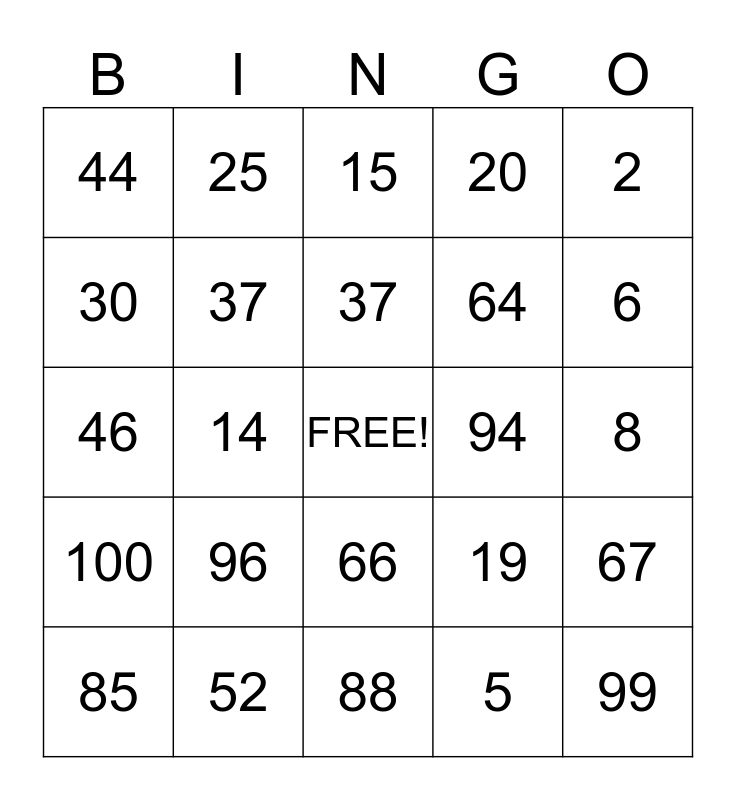 This bingo card has a free space and 24 words: 96, 52, 37, 85, 2, 44, 30, 25, 94, 66, 64, 46, 19, 67, 37, 5, 8, 15, 6, 14, 99, 100, 20 and 88.