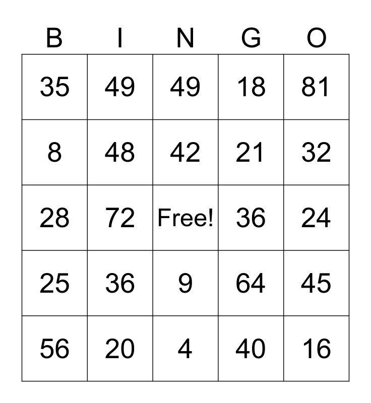 This bingo card has a free space and 24 words: 36, 20, 42, 56, 81, 35, 8, 49, 36, 9, 21, 28, 64, 45, 48, 40, 24, 49, 32, 72, 16, 25, 18 and 4.