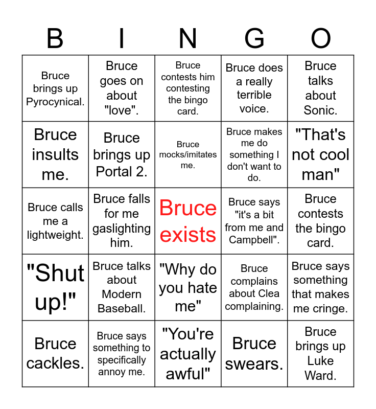 This bingo card has a free space and 24 words: Bruce talks about Modern Baseball., Bruce says something to specifically annoy me., Bruce mocks/imitates me., Bruce cackles., Bruce talks about Sonic., Bruce brings up Pyrocynical., Bruce insults me., Bruce goes on about "love"., Bruce says "it's a bit from me and Campbell"., "Why do you hate me", Bruce makes me do something I don't want to do., Bruce calls me a lightweight., Bruce complains about Clea complaining., Bruce says something that makes me cringe., Bruce brings up Portal 2., Bruce swears., Bruce contests the bingo card., Bruce contests him contesting the bingo card., "That's not cool man", Bruce falls for me gaslighting him., Bruce brings up Luke Ward., "Shut up!", Bruce does a really terrible voice. and "You're actually awful".