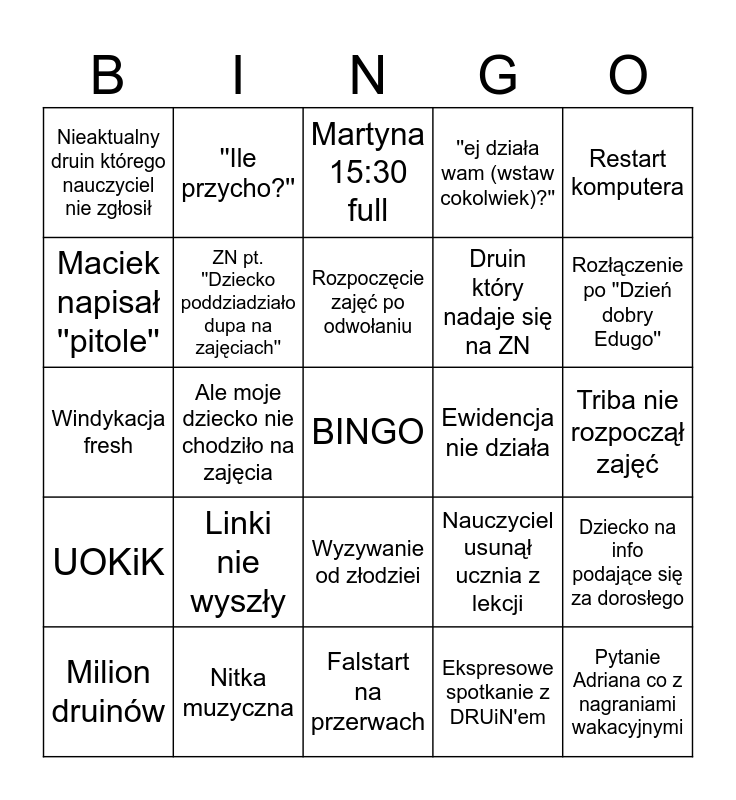 This bingo card has a free space and 24 words: Milion druinów, Linki nie wyszły, Rozpoczęcie zajęć po odwołaniu, Ekspresowe spotkanie z DRUiN'em, Restart komputera, Nieaktualny druin którego nauczyciel nie zgłosił, ''Ile przycho?'', Martyna 15:30 full, Ewidencja nie działa, Triba nie rozpoczął zajęć, Windykacja fresh, ZN pt. ''Dziecko poddziadziało dupa na zajęciach'', Nauczyciel usunął ucznia z lekcji, Dziecko na info podające się za dorosłego, Maciek napisał ''pitole'', Nitka muzyczna, Falstart na przerwach, ''ej działa wam (wstaw cokolwiek)?'', Rozłączenie po ''Dzień dobry Edugo'', UOKiK, Ale moje dziecko nie chodziło na zajęcia, Wyzywanie od złodziei, Druin który nadaje się na ZN and Pytanie Adriana co z nagraniami wakacyjnymi.