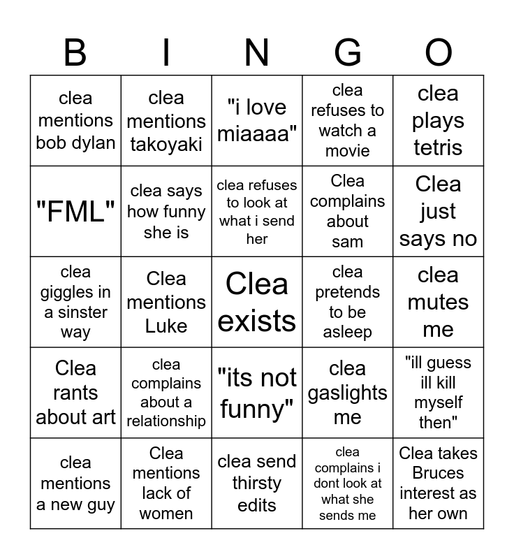 This bingo card has a free space and 24 words: clea mentions a new guy, clea complains about a relationship, clea refuses to look at what i send her, clea complains i dont look at what she sends me, clea plays tetris, clea mentions bob dylan, clea mentions takoyaki, "i love miaaaa", clea pretends to be asleep, clea mutes me, clea giggles in a sinster way, clea says how funny she is, clea gaslights me, "ill guess ill kill myself then", "FML", Clea mentions lack of women, clea send thirsty edits, clea refuses to watch a movie, Clea just says no, Clea rants about art, Clea mentions Luke, "its not funny", Clea complains about sam and Clea takes Bruces interest as her own.