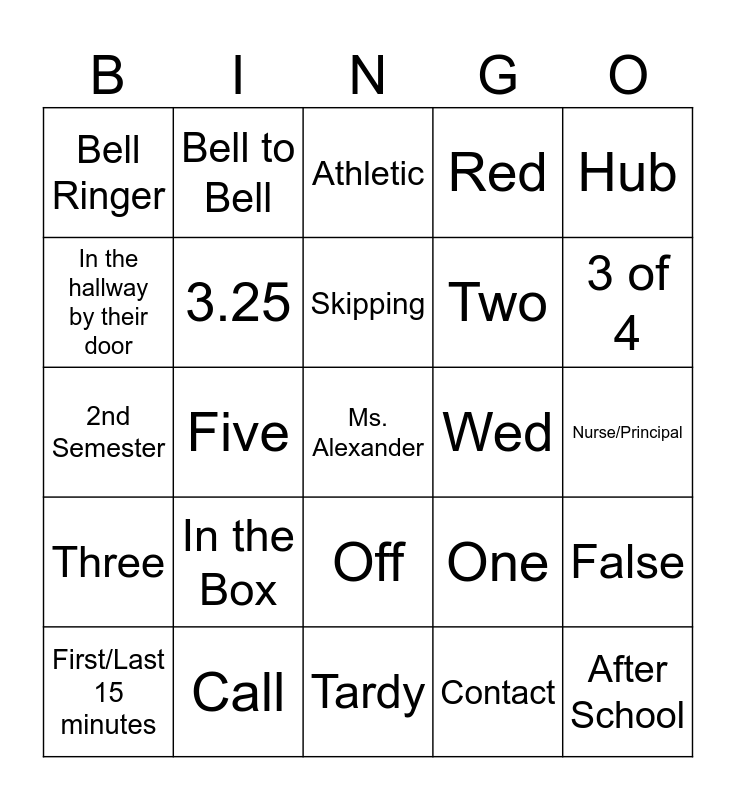 This bingo card has 25 words: In the Box, Tardy, Skipping, First/Last 15 minutes, Hub, Bell Ringer, In the hallway by their door, Bell to Bell, Wed, Off, Two, 2nd Semester, One, False, 3.25, After School, Nurse/Principal, Athletic, 3 of 4, Five, Ms. Alexander, Call, Three, Red and Contact.