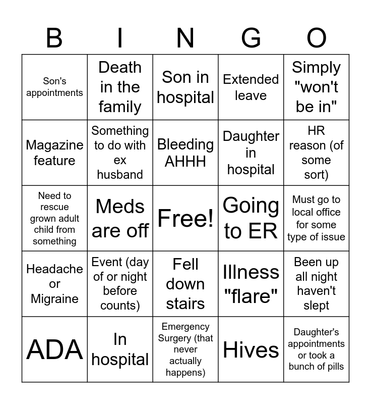 This bingo card has a free space and 24 words: Event (day of or night before counts), In hospital, Bleeding AHHH, ADA, Simply "won't be in", Son's appointments, Magazine feature, Death in the family, Going to ER, Fell down stairs, Daughter in hospital, Need to rescue grown adult child from something, Illness "flare", Been up all night haven't slept, Something to do with ex husband, Hives, Must go to local office for some type of issue, Son in hospital, HR reason (of some sort), Meds are off, Daughter's appointments or took a bunch of pills, Headache or Migraine, Extended leave and Emergency Surgery (that never actually happens).