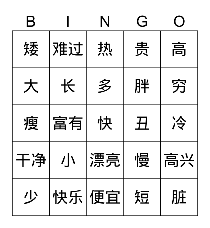 This bingo card has a free space and 24 words: 小, 快乐, 多, 少, 高, 矮, 大, 难过, 丑, 漂亮, 胖, 瘦, 慢, 高兴, 长, 短, 冷, 热, 穷, 富有, 脏, 干净, 贵 and 便宜.
