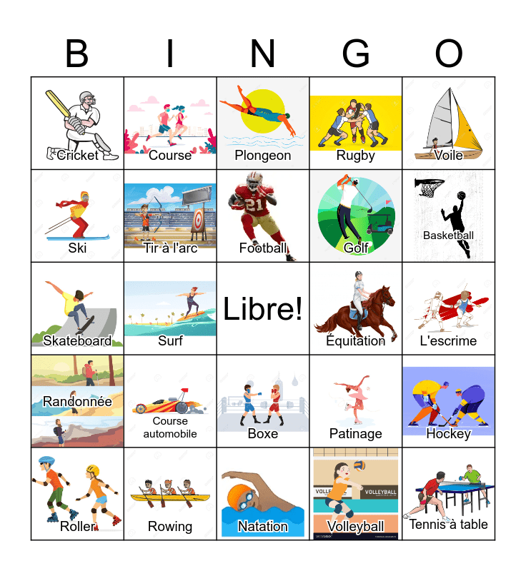 This bingo card has 34 images, a free space and 34 words: Danse, Volleyball, Bicyclette, Baseball, Randonnée, Tir à l'arc, Voile, Roller, Course, Tennis, Football, Plongeon, Aérobic, Soccer, Équitation, Basketball, Rowing, Skateboard, Course automobile, Patinage, Boxe, Escalade, Cricket, L'escrime, Natation, Tennis à table, Rugby, Weightlifting, Golf, Ski, Motocyclette, Surf, Hockey and Yoga.