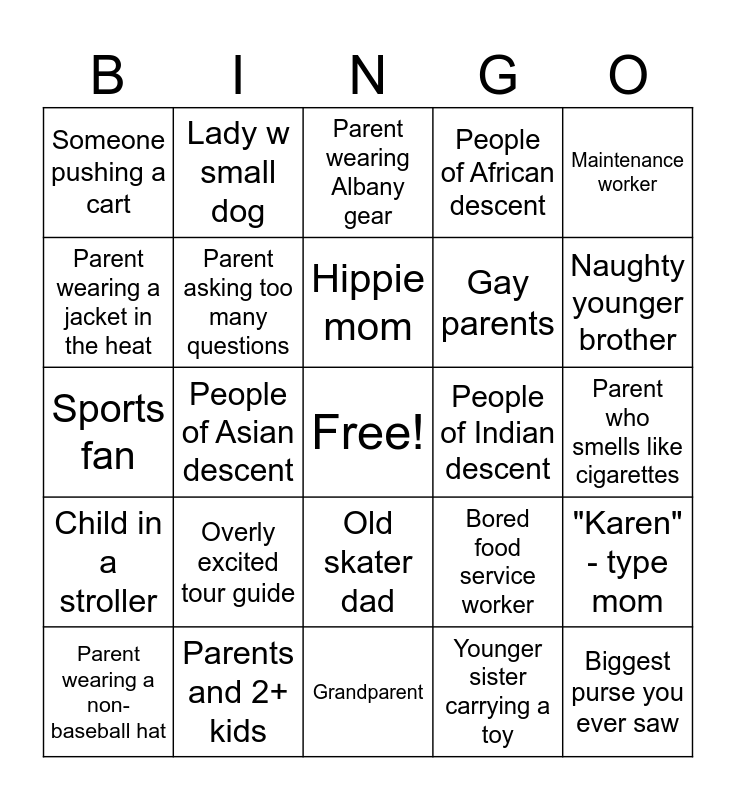 This bingo card has a free space and 24 words: Overly excited tour guide, Parents and 2+ kids, Hippie mom, Parent wearing a non-baseball hat, Maintenance worker, Someone pushing a cart, Parent wearing a jacket in the heat, Lady w small dog, People of Indian descent, Old skater dad, Gay parents, Sports fan, Bored food service worker, "Karen" - type mom, Parent asking too many questions, Younger sister carrying a toy, Parent who smells like cigarettes, Parent wearing Albany gear, Naughty younger brother, People of Asian descent, Biggest purse you ever saw, Child in a stroller, People of African descent and Grandparent.