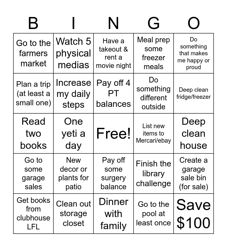 This bingo card has a free space and 24 words: New decor or plants for patio, Clean out storage closet, Pay off 4 PT balances, Get books from clubhouse LFL, Do something that makes me happy or proud, Go to the farmers market, Plan a trip (at least a small one), Watch 5 physical medias, List new items to Mercari/ebay, Pay off some surgery balance, Do something different outside, Read two books, Finish the library challenge, Create a garage sale bin (for sale), Increase my daily steps, Go to the pool at least once, Deep clean house, Have a takeout & rent a movie night, Deep clean fridge/freezer, One yeti a day, Save $100, Go to some garage sales, Meal prep some freezer meals and Dinner with family.