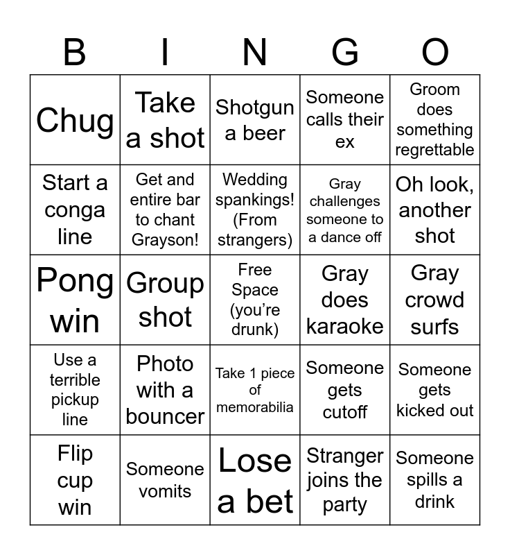 This bingo card has a free space and 24 words: Photo with a bouncer, Someone vomits, Wedding spankings! (From strangers), Flip cup win, Groom does something regrettable, Chug, Start a conga line, Take a shot, Gray does karaoke, Take 1 piece of memorabilia, Gray challenges someone to a dance off, Pong win, Someone gets cutoff, Someone gets kicked out, Get and entire bar to chant Grayson!, Stranger joins the party, Gray crowd surfs, Shotgun a beer, Oh look, another shot, Group shot, Someone spills a drink, Use a terrible pickup line, Someone calls their ex and Lose a bet.