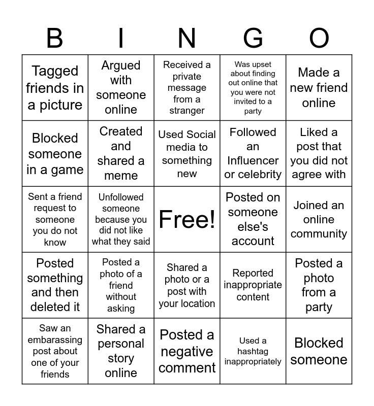This bingo card has a free space and 24 words: Posted a photo of a friend without asking, Shared a personal story online, Used Social media to something new, Saw an embarassing post about one of your friends, Made a new friend online, Tagged friends in a picture, Blocked someone in a game, Argued with someone online, Posted on someone else's account, Shared a photo or a post with your location, Followed an Influencer or celebrity, Sent a friend request to someone you do not know, Reported inappropriate content, Posted a photo from a party, Created and shared a meme, Used a hashtag inappropriately, Joined an online community, Received a private message from a stranger, Liked a post that you did not agree with, Unfollowed someone because you did not like what they said, Blocked someone, Posted something and then deleted it, Was upset about finding out online that you were not invited to a party and Posted a negative comment.