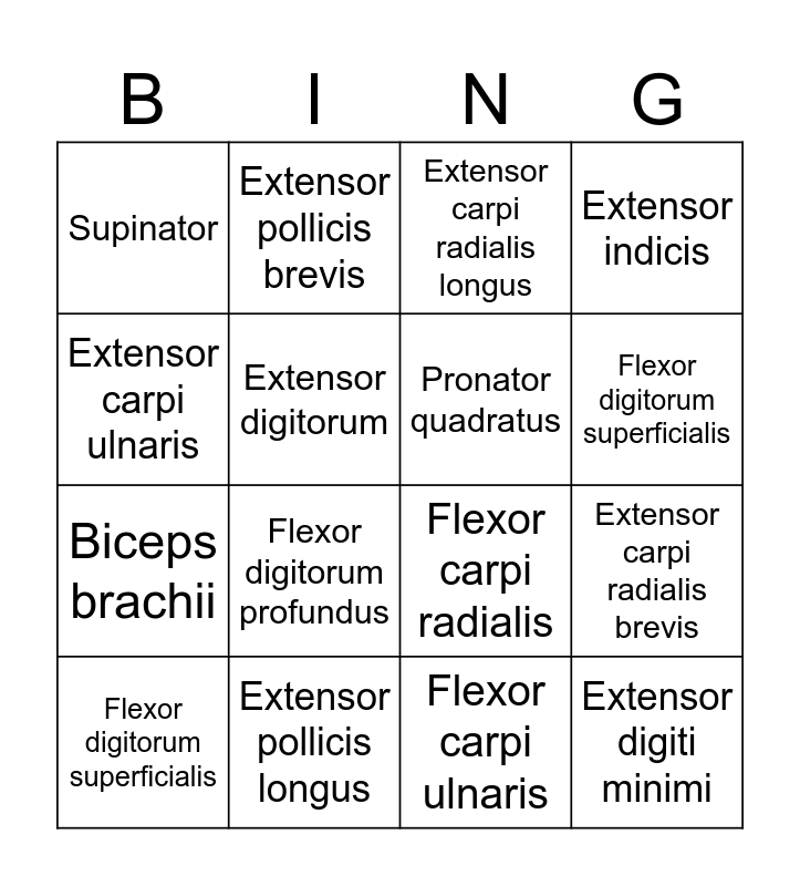 This bingo card has 19 words: Flexor carpi radialis, Palmaris longus, Extensor carpi radialis longus, Extensor digiti minimi, Extensor carpi radialis brevis, Extensor carpi ulnaris, Flexor carpi ulnaris, Supinator, Extensor pollicis brevis, Biceps brachii, Flexor digitorum profundus, Extensor digitorum, Pronator quadratus, Extensor pollicis longus, Flexor digitorum superficialis, Pronator teres, Extensor indicis, Flexor digitorum superficialis and Brachioradialis.