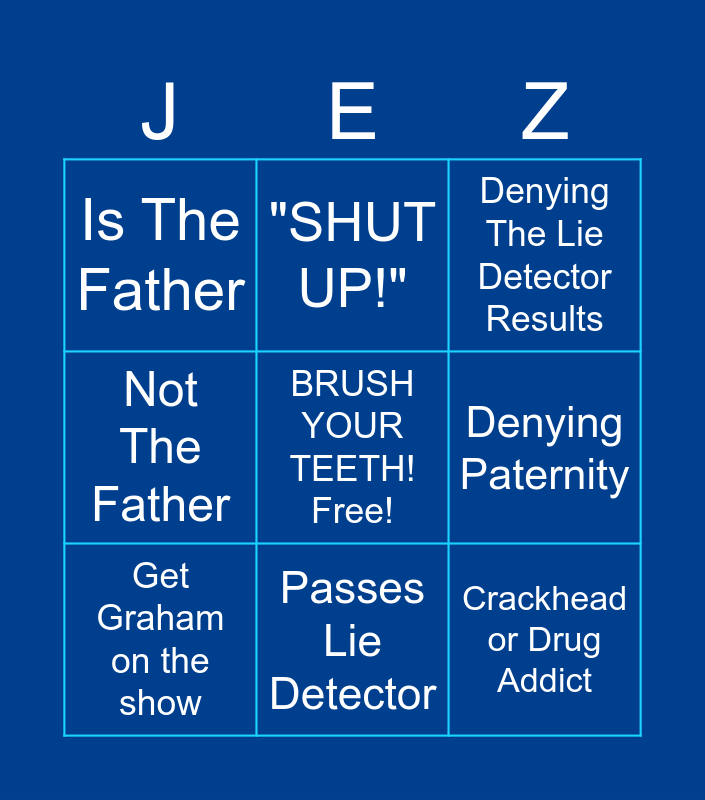 This bingo card has a free space and 14 words: Security Gets Involved, Lie Detector Fail, Get Graham on the show, "SHUT UP!", Not The Father, Crackhead or Drug Addict, Kicked off stage, Guest Comes out before Jeremy Introduces them, Passes Lie Detector, Is The Father, Deadbeat Father, Denying Paternity, Denying The Lie Detector Results and STOP, THIEF!.