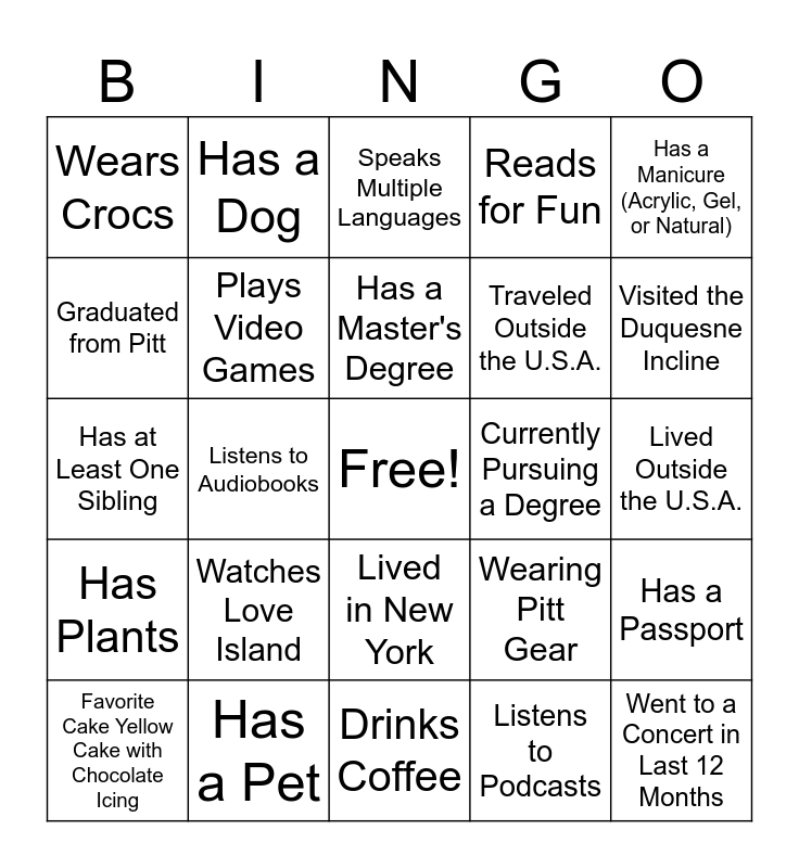 This bingo card has a free space and 24 words: Watches Love Island, Has a Pet, Has a Master's Degree, Favorite Cake Yellow Cake with Chocolate Icing, Has a Manicure (Acrylic, Gel, or Natural), Wears Crocs, Graduated from Pitt, Has a Dog, Currently Pursuing a Degree, Lived in New York, Traveled Outside the U.S.A., Has at Least One Sibling, Wearing Pitt Gear, Has a Passport, Plays Video Games, Listens to Podcasts, Lived Outside the U.S.A., Speaks Multiple Languages, Visited the Duquesne Incline, Listens to Audiobooks, Went to a Concert in Last 12 Months, Has Plants, Reads for Fun and Drinks Coffee.