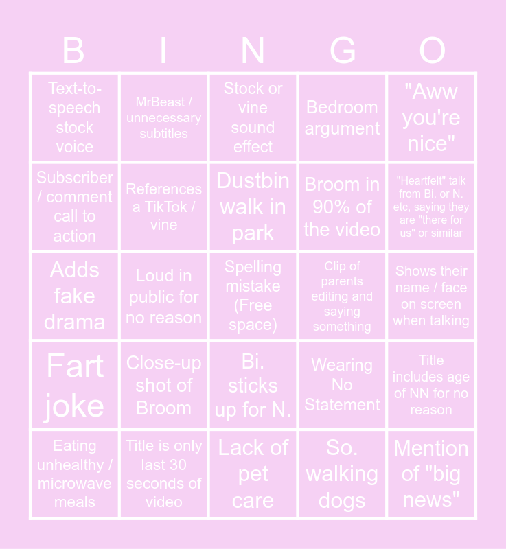 This bingo card has a free space and 64 words: Bi. cringe editing, Sabre over-emotional, Sabre / N. fight, So. walking dogs, Shows clip of previous video, Wearing NN fashion, MrBeast / unnecessary subtitles, Inappropriate joke for their audience, Clip of parents editing and saying something, Pretends to do school work, Fart joke, Clip of NN editing and saying something, Wearing No Statement, "Aww you're nice", Shows the Bondi house "almost finished" but nothing has changed, References a TikTok / vine, Dustbin walk in park, Bedroom argument, Way too overedited, Subscriber / comment call to action, Title is only last 30 seconds of video, Bi. sticks up for N., Broom in 90% of the video, Mention of "big news", D. / C. being ipad kids, So. showing dogs doing tricks, Editing mistake, Unnecessary graphic on screen, Shows their name / face on screen when talking, Eating unhealthy / microwave meals, Video is faked, N. copying Sabre, References their music video, Meeting legends, Adds fake drama, Sabre / N. getting a random gift, Messy handwriting, Swearing and trying to cover it up (Sabre cheese / sh!t incident), Inappropriate comment for their young audience, Text-to-speech stock voice, Loud in public for no reason, Lack of pet care, Pranks / scaring others, "Slendermum" or "Gamerdad" mention, NN are oblivious to an everyday thing, Close-up shot of Broom, Bad camera angle, Referring to us as "family", "Heartfelt" talk from Bi. or N. etc, saying they are "there for us" or similar, Broom doing voiceover at start of video, Oddly strange thumbnail, Talk about Dustbin being Olympic swimmer for no reason, Talks about stuff being "too expensive", Title includes age of NN for no reason, Unnecessary voiceover / explaining family, Repeats rules of a challenge, Stock or vine sound effect, Mentions the "new Y2K", Alludes to upcoming bit in video saying "keep watching", "What I love most about __ is", References one of their YT shorts, NN cannot do a simple everyday task, Over-explaining a simple thing and Exploits NN emotions for video.