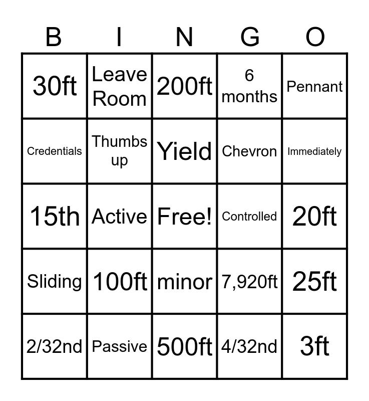 This bingo card has a free space and 24 words: 100ft, Passive, Yield, 2/32nd, Pennant, 30ft, Credentials, Leave Room, Controlled, minor, Chevron, 15th, 7,920ft, 25ft, Thumbs up, 4/32nd, 20ft, 200ft, Immediately, Active, 3ft, Sliding, 6 months and 500ft.