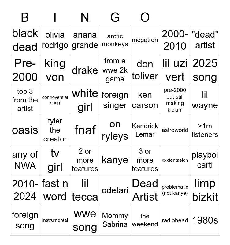 This bingo card has a free space and 48 words: Dead Artist, lil uzi vert, Mommy Sabrina, tyler the creator, white girl, >1m listeners, olivia rodrigo, instrumental, 2000-2010, kanye, "dead" artist, arctic monkeys, pre-2000 but still making kickin', ken carson, 2010-2024, astroworld, Pre-2000, 2025 song, problematic (not kanye), megatron, don toliver, fnaf, black dead, king von, limp bizkit, drake, lil wayne, foreign song, foreign singer, controversial song, radiohead, Kendrick Lemar, playboi carti, fast n word, oasis, 3 or more features, xxxtentasion, top 3 from the artist, 2 or more features, lil tecca, any of NWA, 1980s, ariana grande, wwe song, from a wwe 2k game, odetari, tv girl and the weekend.