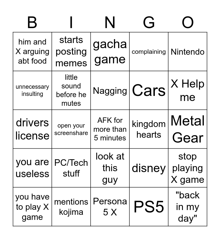 This bingo card has a free space and 24 words: PC/Tech stuff, mentions kojima, Nagging, you have to play X game, Nintendo, him and X arguing abt food, unnecessary insulting, starts posting memes, kingdom hearts, look at this guy, Cars, drivers license, disney, stop playing X game, little sound before he mutes, PS5, Metal Gear, gacha game, X Help me, open your screenshare, "back in my day", you are useless, complaining and Persona 5 X.