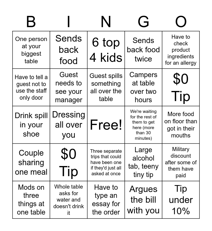 This bingo card has a free space and 24 words: $0 Tip, Whole table asks for water and doesn't drink it, Guest spills something all over the table, Mods on three things at one table, Have to check product ingredients for an allergy, One person at your biggest table, Have to tell a guest not to use the staff only door, Sends back food, We're waiting for the rest of them to get here (more than 30 minutes), Three separate trips that could have been one if they'd just all asked at once, Campers at table over two hours, Drink spill in your shoe, Large alcohol tab, teeny tiny tip, Military discount after some of them have paid, Guest needs to see your manager, Argues the bill with you, More food on floor than got in their mouths, 6 top 4 kids, $0 Tip, Dressing all over you, Tip under 10%, Couple sharing one meal, Sends back food twice and Have to type an essay for the order.
