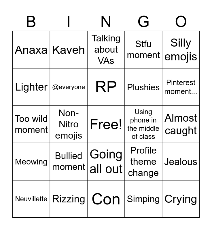 This bingo card has a free space and 34 words: Sigh, Simping, Crashout, Sus moments, Meowing, @everyone, Silly emojis, Neuvillette, Kaveh, Shipping, RP, Talking about VAs, Exposing someone, Spending money, Using phone in the middle of class, Pinterest moment..., Rizzing, Too wild moment, Bullied moment, Profile theme change, Going all out, Sis attack, Anaxa, Almost caught, Con, Crying, Stfu moment, Bro is too energetic to sleep, Plushies, Lighter, Awkward moment, Non-Nitro emojis, Jealous and I hate Michigan AAA moment.
