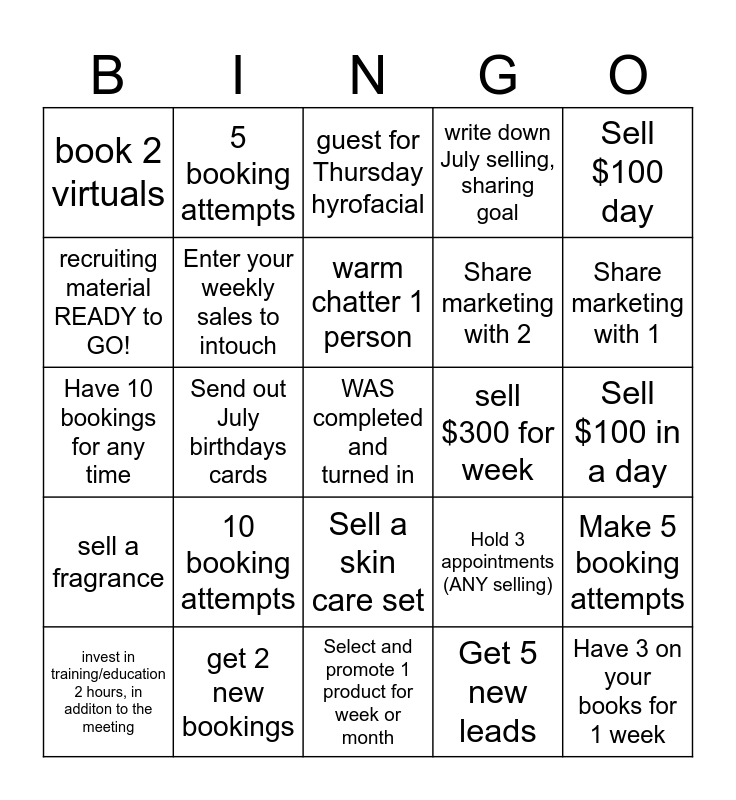 This bingo card has 25 words: 10 booking attempts, Select and promote 1 product for week or month, warm chatter 1 person, invest in training/education 2 hours, in additon to the meeting, Sell $100 day, book 2 virtuals, recruiting material READY to GO!, 5 booking attempts, sell $300 for week, Sell a skin care set, Share marketing with 2, Have 10 bookings for any time, Hold 3 appointments (ANY selling), Make 5 booking attempts, Enter your weekly sales to intouch, Have 3 on your books for 1 week, Sell $100 in a day, guest for Thursday hyrofacial, Share marketing with 1, Send out July birthdays cards, WAS completed and turned in, get 2 new bookings, sell a fragrance, write down July selling, sharing goal and Get 5 new leads.