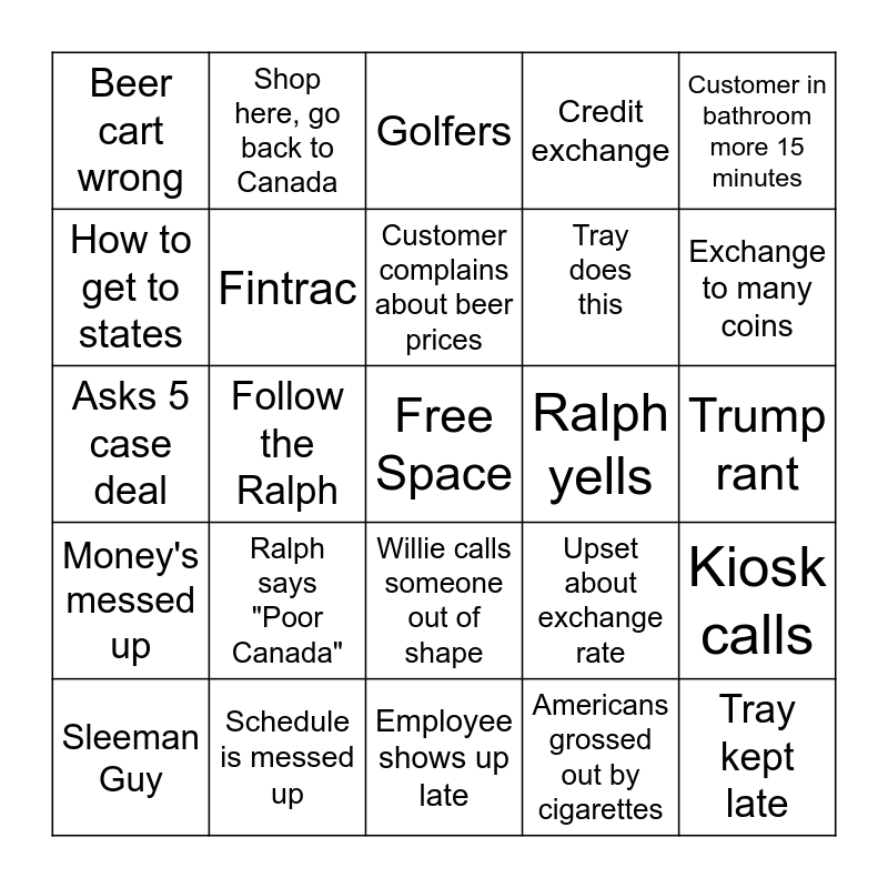 This bingo card has a free space and 24 words: Ralph says "Poor Canada", Schedule is messed up, Customer complains about beer prices, Sleeman Guy, Customer in bathroom more 15 minutes, Beer cart wrong, How to get to states, Shop here, go back to Canada, Ralph yells, Willie calls someone out of shape, Tray does this, Asks 5 case deal, Upset about exchange rate, Kiosk calls, Fintrac, Americans grossed out by cigarettes, Trump rant, Golfers, Exchange to many coins, Follow the Ralph, Tray kept late, Money's messed up, Credit exchange and Employee shows up late.