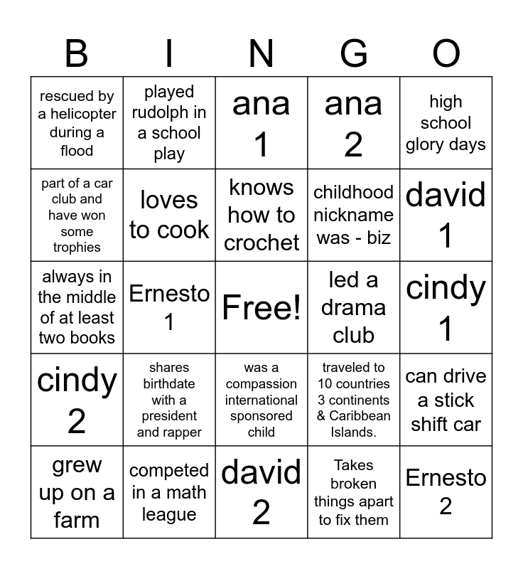 This bingo card has a free space and 24 words: shares birthdate with a president and rapper, competed in a math league, knows how to crochet, grew up on a farm, high school glory days, rescued by a helicopter during a flood, part of a car club and have won some trophies, played rudolph in a school play, led a drama club, was a compassion international sponsored child, childhood nickname was - biz, always in the middle of at least two books, traveled to 10 countries 3 continents & Caribbean Islands., can drive a stick shift car, loves to cook, Takes broken things apart to fix them, cindy 1, ana 1, david 1, Ernesto 1, Ernesto 2, cindy 2, ana 2 and david 2.