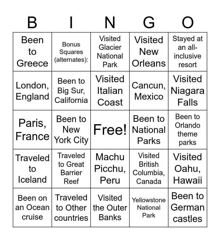 This bingo card has a free space and 36 words: Been to Bali, Indonesia, Visited Barcelona, Spain, Vacationed in the Bahamas, Been to Big Sur, California, Visited British Columbia, Canada, Traveled to Iceland, Visited Italian Coast, Been to Irish countryside, Stayed at an all-inclusive resort, Explored an island, Been to New York City, Visited New Orleans, Traveled to Nashville, Been to National Parks, Visited Niagara Falls, Been to Greece, Visited Grand Canyon, Traveled to Great Barrier Reef, Been to German castles, Visited Glacier National Park, Been to Orlando theme parks, Visited Oahu, Hawaii, Traveled to Other countries, Been on an Ocean cruise, Visited the Outer Banks, Bonus Squares (alternates):, Paris, France, Tokyo, Japan, Cancun, Mexico, London, England, Las Vegas, Nevada, Caribbean Islands, Yellowstone National Park, Machu Picchu, Peru, African Safari and Great Wall of China.
