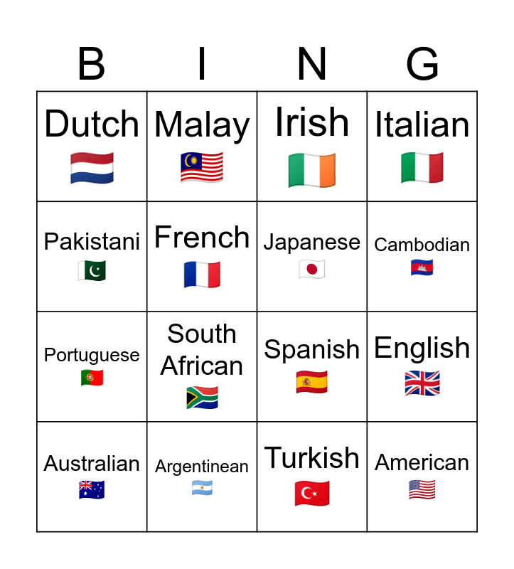 This bingo card has 16 words: Argentinean ๐ฆ๐ท, English ๐ฌ๐ง, Irish ๐ฎ๐ช, Dutch ๐ณ๐ฑ, Portuguese ๐ต๐น, Malay ๐ฒ๐พ, Spanish ๐ช๐ธ, Turkish ๐น๐ท, Pakistani๐ต๐ฐ, French ๐ซ๐ท, Australian ๐ฆ๐บ, Italian ๐ฎ๐น, South African ๐ฟ๐ฆ, Cambodian ๐ฐ๐ญ, Japanese ๐ฏ๐ต and American ๐บ๐ฒ.
