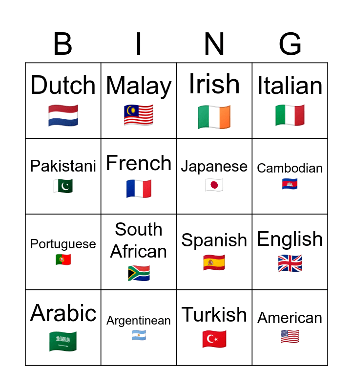 This bingo card has 16 words: Argentinean ๐ฆ๐ท, English ๐ฌ๐ง, Irish ๐ฎ๐ช, Dutch ๐ณ๐ฑ, Portuguese ๐ต๐น, Malay ๐ฒ๐พ, Spanish ๐ช๐ธ, Turkish ๐น๐ท, Pakistani๐ต๐ฐ, French ๐ซ๐ท, Arabic ๐ธ๐ฆ, Italian ๐ฎ๐น, South African ๐ฟ๐ฆ, Cambodian ๐ฐ๐ญ, Japanese ๐ฏ๐ต and American ๐บ๐ฒ.