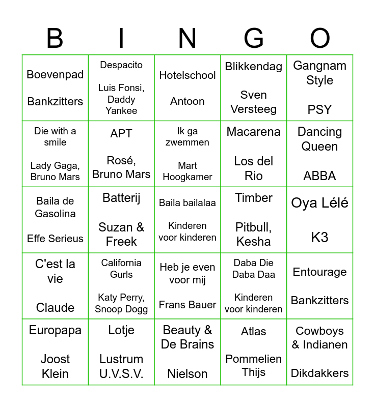 This bingo card has 59 words: Ordinary Alex Warren, Lotje Lustrum U.V.S.V., Echte liefde is te koop Samuel Welten, C'est la vie Claude, Atlas Pommelien Thijs, Beetje van mij Antoon, APT Rosé, Bruno Mars, Engelbewaarder Marco Schuitmaker, Macarena Los del Rio, Terug in de tijd Yves Berendse, Blikkendag Sven Versteeg, Ushuaia Turfy Gang, Russo, Die with a smile Lady Gaga, Bruno Mars, Waka Noano, Emms, Zoet, zout, zuur Robert van Hemert, Boevenpad Bankzitters, Baila bailalaa Kinderen voor kinderen, Gangnam Style PSY, Can't stop the feeling Justin Timberlake, Ik ga zwemmen Mart Hoogkamer, Timber Pitbull, Kesha, Hotelschool Antoon, Europapa Joost Klein, Entourage Bankzitters, Hartslag van de stad Tino Martin, Mart Hoogkamer, Padellen Turfy Gang, La$$a, Ik neem je mee Gers Pardoel, De overkant Suzan & Freek, Dancing Queen ABBA, Wannabe Spice Girls, Baby Justin Bieber, Ludacris, Duurt te lang Davina Michelle, Dromendans Vinzzent, Shape of you Ed Sheeran, Despacito Luis Fonsi, Daddy Yankee, Más más más Rolf Sanchez, Dynamite Taio Cruz, Batterij Suzan & Freek, Brabant Guus Meeuwis, Baila de Gasolina Effe Serieus, Boom boom bailando Jan Smit, California Gurls Katy Perry, Snoop Dogg, Oya Lélé K3, Amsterdam Flemming, I ain't worried OneRepublic, Hall of Fame The Script, Will.i.am, Beat It Michael Jackso, Blame it on the Boogie The Jacksons, Heb je even voor mij Frans Bauer, Beauty & De Brains Nielson, Viben K-Liber, Boom, Boom, Boom!! Vengaboys, Bewegen is gezond Kinderen voor kinderen, Vamos a la Playa Miranda, Greased Lightning John Travolta, Jeff Conaway, Daba Die Daba Daa Kinderen voor kinderen, ZiggZagg Kinderen voor kinderen, Cowboys & Indianen Dikdakkers and 1001 Arabian Nights Chipz.