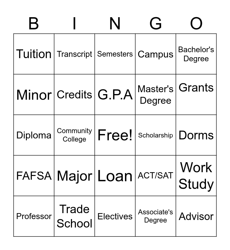 This bingo card has a free space and 24 words: Major, Trade School, G.P.A, Professor, Bachelor's Degree, Tuition, Minor, Transcript, Scholarship, Loan, Master's Degree, Diploma, ACT/SAT, Work Study, Credits, Associate's Degree, Dorms, Semesters, Grants, Community College, Advisor, FAFSA, Campus and Electives.