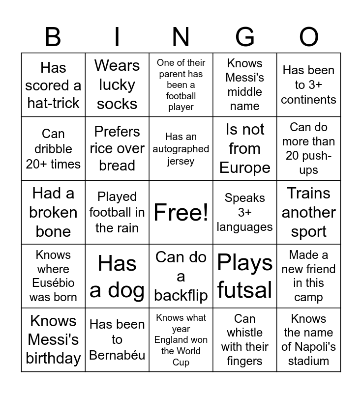 This bingo card has a free space and 24 words: Has a dog, Has been to Bernabéu, Has an autographed jersey, Knows Messi's birthday, Has been to 3+ continents, Has scored a hat-trick, Can dribble 20+ times, Wears lucky socks, Speaks 3+ languages, Can do a backflip, Is not from Europe, Had a broken bone, Plays futsal, Made a new friend in this camp, Prefers rice over bread, Can whistle with their fingers, Trains another sport, One of their parent has been a football player, Can do more than 20 push-ups, Played football in the rain, Knows the name of Napoli's stadium, Knows where Eusébio was born, Knows Messi's middle name and Knows what year England won the World Cup.