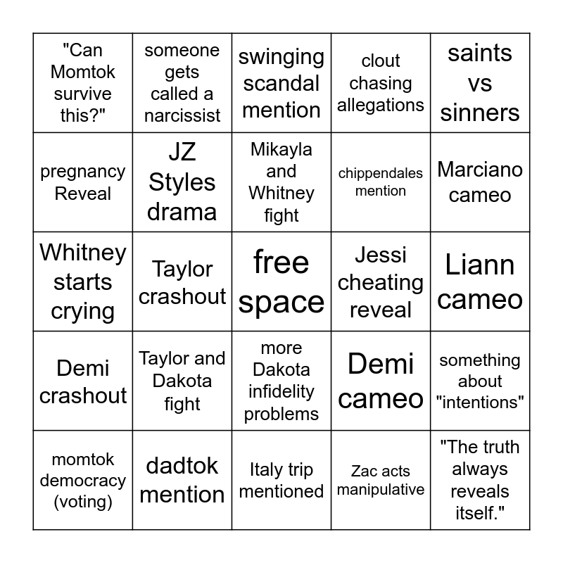 This bingo card has a free space and 24 words: Taylor and Dakota fight, dadtok mention, Mikayla and Whitney fight, momtok democracy (voting), saints vs sinners, "Can Momtok survive this?", pregnancy Reveal, someone gets called a narcissist, Jessi cheating reveal, more Dakota infidelity problems, chippendales mention, Whitney starts crying, Demi cameo, something about "intentions", JZ Styles drama, Zac acts manipulative, Liann cameo, swinging scandal mention, Marciano cameo, Taylor crashout, "The truth always reveals itself.", Demi crashout, clout chasing allegations and Italy trip mentioned.