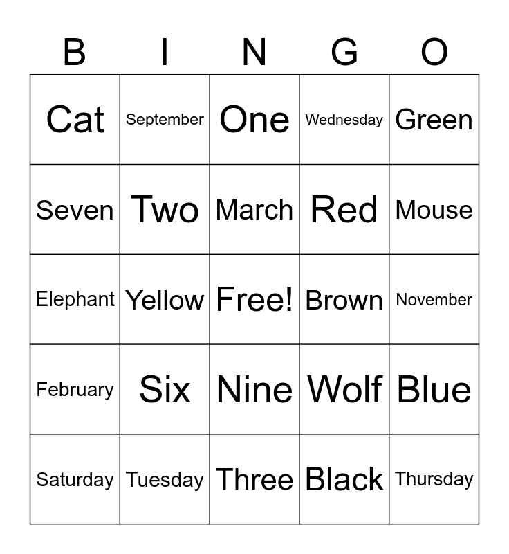 This bingo card has a free space and 24 words: Six, Tuesday, March, Saturday, Green, Cat, Seven, September, Brown, Nine, Red, Elephant, Wolf, Blue, Two, Black, November, One, Mouse, Yellow, Thursday, February, Wednesday and Three.