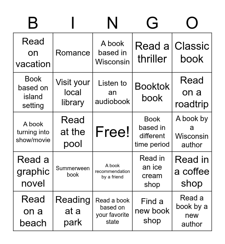 This bingo card has a free space and 24 words: Summerween book, Reading at a park, Listen to an audiobook, Read on a beach, Classic book, Read on vacation, Book based on island setting, Romance, Book based in different time period, A book recommendation by a friend, Booktok book, A book turning into show/movie, Read in an ice cream shop, Read in a coffee shop, Visit your local library, Find a new book shop, A book by a Wisconsin author, A book based in Wisconsin, Read on a roadtrip, Read at the pool, Read a book by a new author, Read a graphic novel, Read a thriller and Read a book based on your favorite state.