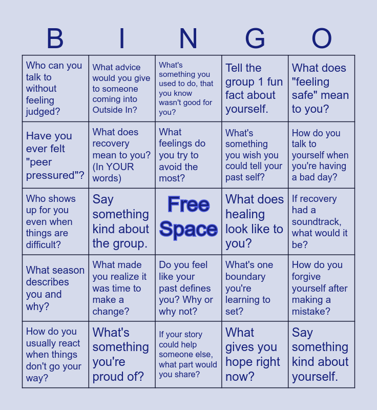 This bingo card has a free space and 24 words: What made you realize it was time to make a change?, What's something you're proud of?, What feelings do you try to avoid the most?, How do you usually react when things don't go your way?, What does "feeling safe" mean to you?, Who can you talk to without feeling judged?, Have you ever felt "peer pressured"?, What advice would you give to someone coming into Outside In?, What does healing look like to you?, Do you feel like your past defines you? Why or why not?, What's something you wish you could tell your past self?, Who shows up for you even when things are difficult?, What's one boundary you're learning to set?, How do you forgive yourself after making a mistake?, What does recovery mean to you? (In YOUR words), What gives you hope right now?, If recovery had a soundtrack, what would it be?, What's something you used to do, that you know wasn't good for you?, How do you talk to yourself when you're having a bad day?, Say something kind about the group., Say something kind about yourself., What season describes you and why?, Tell the group 1 fun fact about yourself. and If your story could help someone else, what part would you share?.