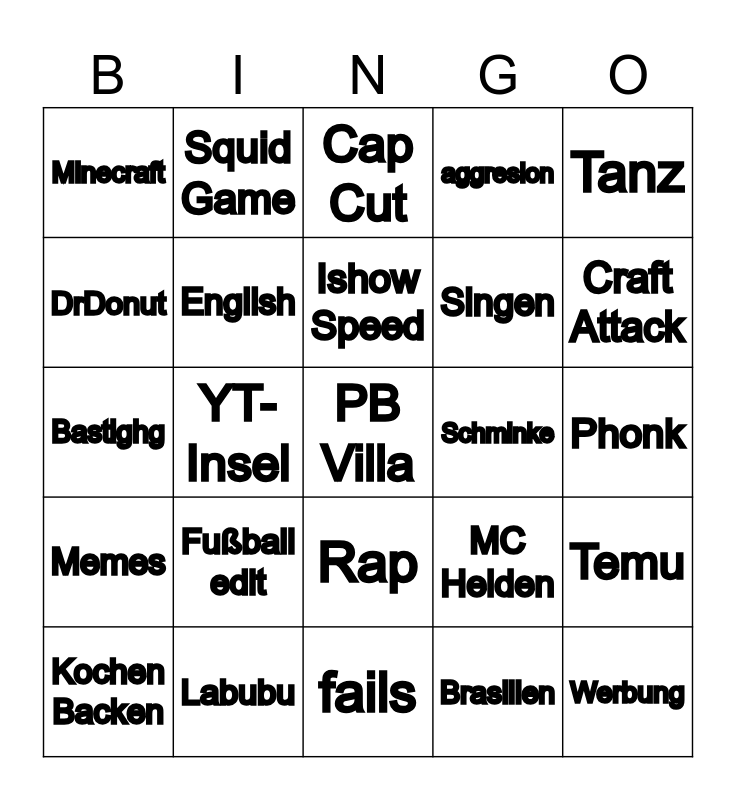 This bingo card has a free space and 24 words: Fußball edit, Labubu, Ishow Speed, Kochen Backen, Tanz, Minecraft, DrDonut, Squid Game, Schminke, Rap, Singen, Bastighg, MC Helden, Temu, English, Brasilien, Phonk, Cap Cut, Craft Attack, YT-Insel, Werbung, Memes, aggresion and fails.