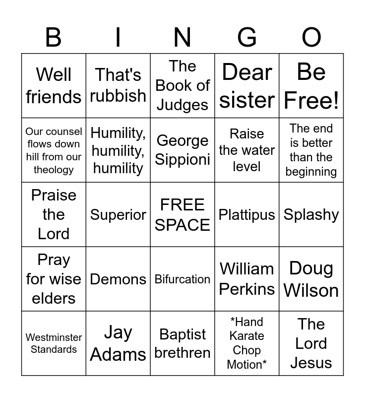 This bingo card has a free space and 24 words: Westminster Standards, Demons, George Sippioni, *Hand Karate Chop Motion*, Be Free!, Well friends, That's rubbish, The Book of Judges, Plattipus, Splashy, Praise the Lord, Humility, humility, humility, William Perkins, Doug Wilson, Our counsel flows down hill from our theology, Jay Adams, Baptist brethren, Dear sister, The end is better than the beginning, Pray for wise elders, Superior, Bifurcation, Raise the water level and The Lord Jesus.
