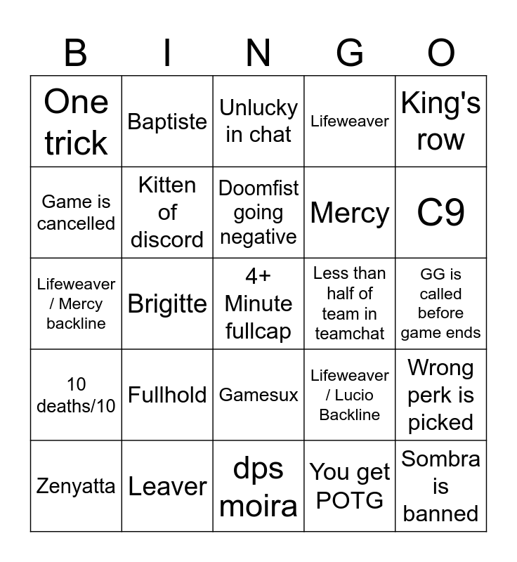 This bingo card has 72 words: Ana, Baptiste, Brigitte, Illari, Juno, Kiriko, Lifeweaver, Lucio, Mercy, Moira, Zenyatta, Ajax, C9, One trick, Streamer mode name, Lifeweaver / Mercy backline, Lifeweaver / Lucio Backline, King's row, Lijiang Tower, GG is called before game ends, Fullhold, 4+ Minute fullcap, Wrong perk is picked, TTV name, Slurs (text or voice), Mercy is banned, Only 3 bans, Widowmaker is banned, 5+ minute queue, Top 500 Player Icon, Leaver, Streamer/Pro, Korean/Japanese Name, 10 ult fight, You get POTG, Solo Ult, Freja Banned, Cheater/Cheat Accusation, Game is cancelled, 1 vote map is picked, Gamesux, Sombra is banned, Pride Flag Player Icon, Israel Player Icon, KSA Player Icon, 10 deaths/10, Rein player with <1k damage after a min, Gooner skin, Fat finger ult, Environmental Kill, >100 meter comeback on push, ? In chat, Dps/Mercy Duo, Less than half of team in teamchat, someone says it's their first game in several weeks/days, green valiant/ yellow mayhem skin, Unlucky in chat, Doomfist going negative, verbally saying drunk/high, bong rip on mic, gamin4hope mention, pro player namedropped, flanking brig, dps moira, reddit lucio, date in battletag, Kitten of discord, Chungus typed in chat, Souvenir used, Voiceline spam, private profile and peak check.