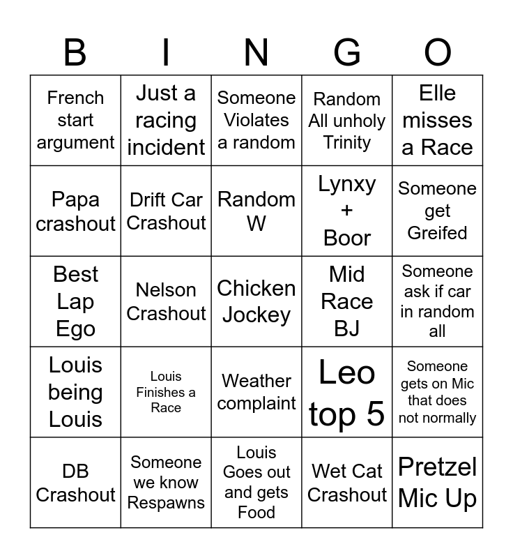 This bingo card has a free space and 27 words: Leo top 5, Louis Nap, Lynxy + Boor, Louis Goes out and gets Food, Papa crashout, Someone Violates a random, Just a racing incident, Louis being Louis, Mid Race BJ, Someone gets on Mic that does not normally, Best Lap Ego, Random All unholy Trinity, DB Crashout, Someone we know Respawns, Someone get Greifed, Someone Injures themselves Mid Race, Drift Car Crashout, Random W, Louis Finishes a Race, French start argument, Someone ask if car in random all, Wet Cat Crashout, Nelson Crashout, Pretzel Mic Up, Weather complaint, Elle misses a Race and Random joins the party.