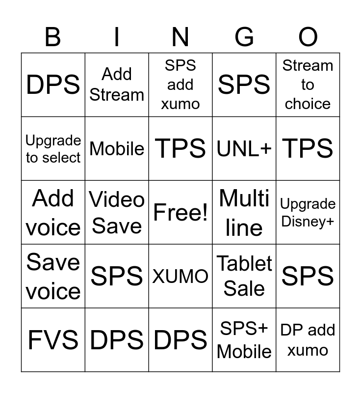 This bingo card has a free space and 24 words: SPS, DPS, TPS, FVS, Stream to choice, DPS, Upgrade to select, Add Stream, Multi line, XUMO, UNL+, Add voice, Tablet Sale, SPS, Mobile, SPS+ Mobile, Upgrade Disney+, SPS add xumo, TPS, Video Save, DP add xumo, Save voice, SPS and DPS.