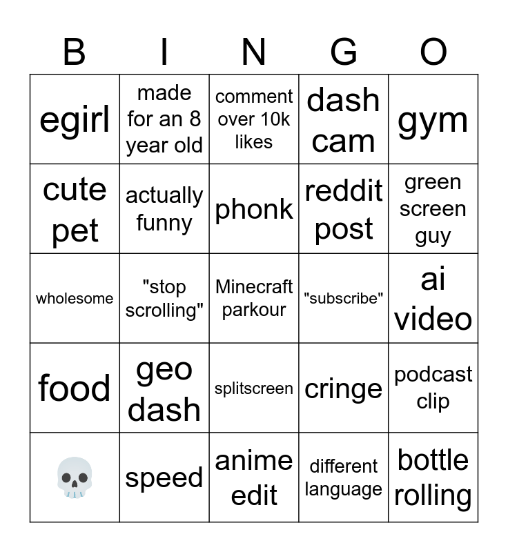 This bingo card has 25 words: geo dash, anime edit, phonk, 💀, gym, egirl, cute pet, made for an 8 year old, "subscribe", splitscreen, reddit post, wholesome, cringe, podcast clip, actually funny, bottle rolling, ai video, comment over 10k likes, green screen guy, "stop scrolling", Minecraft parkour, speed, food, dash cam and different language.
