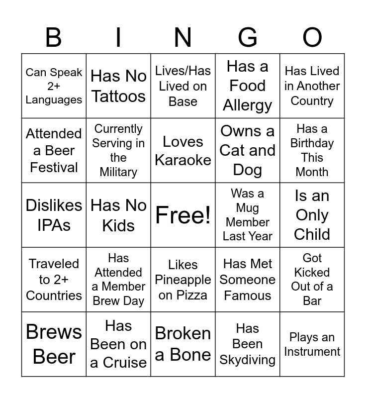 This bingo card has a free space and 24 words: Has Attended a Member Brew Day, Has Been on a Cruise, Loves Karaoke, Brews Beer, Has Lived in Another Country, Can Speak 2+ Languages, Attended a Beer Festival, Has No Tattoos, Was a Mug Member Last Year, Likes Pineapple on Pizza, Owns a Cat and Dog, Dislikes IPAs, Has Met Someone Famous, Got Kicked Out of a Bar, Currently Serving in the Military, Has Been Skydiving, Is an Only Child, Lives/Has Lived on Base, Has a Birthday This Month, Has No Kids, Plays an Instrument, Traveled to 2+ Countries, Has a Food Allergy and Broken a Bone.