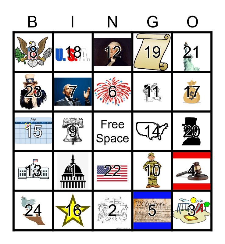 This bingo card has 24 images, a free space and 24 words: 1, 16, 6, 24, 21, 8, 23, 18, 14, 22, 11, 15, 10, 4, 7, 5, 20, 12, 17, 9, 3, 13, 19 and 2.