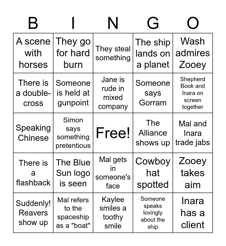 This bingo card has a free space and 24 words: The Blue Sun logo is seen, Mal refers to the spaceship as a "boat", Jane is rude in mixed company, Suddenly! Reavers show up, Wash admires Zooey, A scene with horses, There is a double-cross, They go for hard burn, The Alliance shows up, Mal gets in someone's face, Someone says Gorram, Speaking Chinese, Cowboy hat spotted, Zooey takes aim, Someone is held at gunpoint, Someone speaks lovingly about the ship, Mal and Inara trade jabs, They steal something, Shepherd Book and Inara on screen together, Simon says something pretentious, Inara has a client, There is a flashback, The ship lands on a planet and Kaylee smiles a toothy smile.