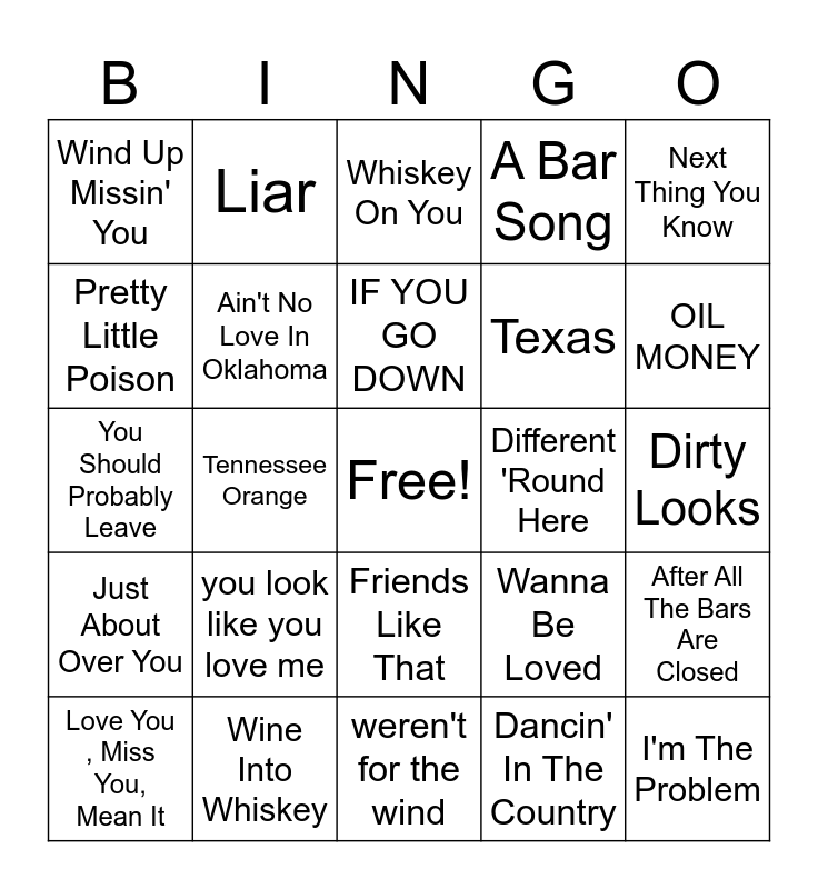 This bingo card has a free space and 50 words: I Never Lie, I'm The Problem, I Ain't Comin' Back, weren't for the wind, you look like you love me, 4x4xU, Liar, Am I Okay?, Pretty Little Poison, Everything She Ain't, Ain't No Love In Oklahoma, A Bar Song, After All The Bars Are Closed, Wanna Be Loved, Bigger Houses, I Had Some Help, IF YOU GO DOWN, Different 'Round Here, Rock and A Hard Place, Next Thing You Know, Tennessee Orange, Dancin' In The Country, Wind Up Missin' You, Texas, World On Fire, Sounds Like the Radio, OIL MONEY, I Got A New One, Whiskey On You, Friends Like That, Handle on You, Miles On It, Dirt Cheap, Don't Mind If I Do, Wine Into Whiskey, Where The Wild Things Are, Wild As Her, Sweet Dreams, Buy Dirt, Dirty Looks, Your Heart or Mine, She Had Me At Heads Carolina, Use Me, Somethin' Bout a Woman, Love You , Miss You, Mean It, You Should Probably Leave, Thinkin' Bout You, Boys Back Home, Just About Over You and Memory I Don't Mess With.