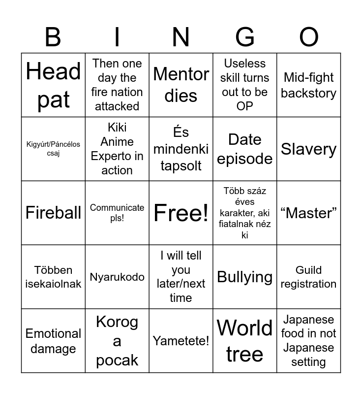 This bingo card has a free space and 24 words: Nyarukodo, Korog a pocak, És mindenki tapsolt, Emotional damage, Mid-fight backstory, Head pat, Kigyúrt/Páncélos csaj, Then one day the fire nation attacked, Több száz éves karakter, aki fiatalnak néz ki, I will tell you later/next time, Date episode, Fireball, Bullying, Guild registration, Kiki Anime Experto in action, World tree, “Master”, Mentor dies, Slavery, Communicate pls!, Japanese food in not Japanese setting, Többen isekaiolnak, Useless skill turns out to be OP and Yametete!.