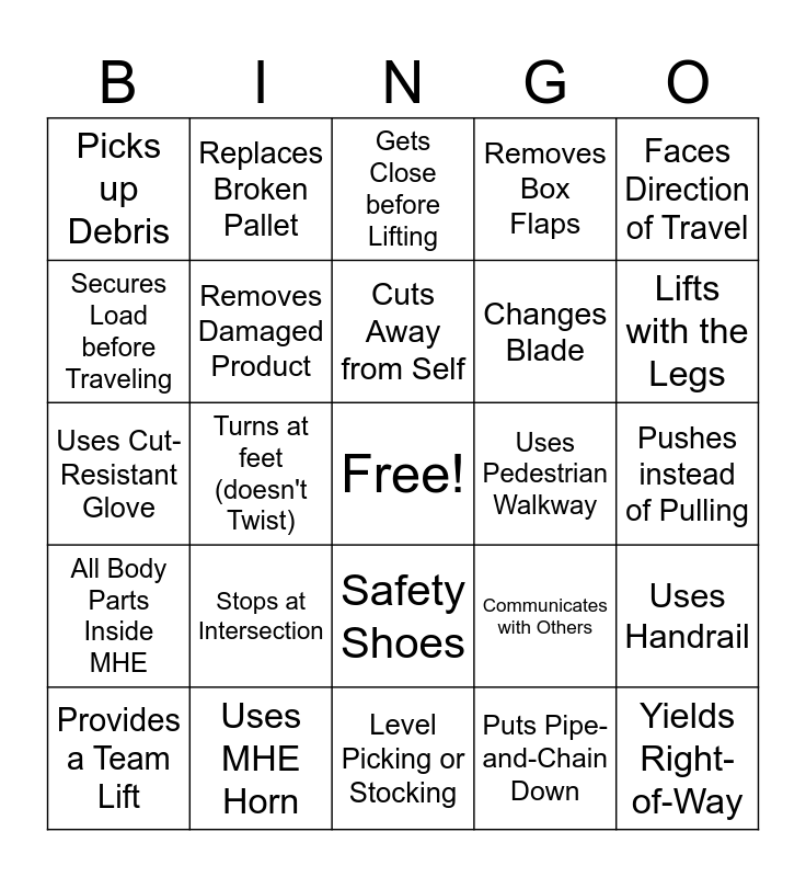 This bingo card has a free space and 24 words: Stops at Intersection, Uses MHE Horn, Cuts Away from Self, Provides a Team Lift, Faces Direction of Travel, Picks up Debris, Secures Load before Traveling, Replaces Broken Pallet, Uses Pedestrian Walkway, Safety Shoes, Changes Blade, Uses Cut-Resistant Glove, Communicates with Others, Uses Handrail, Removes Damaged Product, Puts Pipe-and-Chain Down, Pushes instead of Pulling, Gets Close before Lifting, Lifts with the Legs, Turns at feet (doesn't Twist), Yields Right-of-Way, All Body Parts Inside MHE, Removes Box Flaps and Level Picking or Stocking.