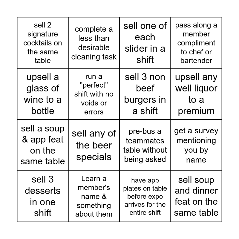 This bingo card has 16 words: Learn a member's name & something about them, get a survey mentioning you by name, sell one of each slider in a shift, sell 2 signature cocktails on the same table, sell a soup & app feat on the same table, complete a less than desirable cleaning task, pre-bus a teammates table without being asked, have app plates on table before expo arrives for the entire shift, upsell a glass of wine to a bottle, run a "perfect" shift with no voids or errors, sell 3 desserts in one shift, pass along a member compliment to chef or bartender, sell any of the beer specials, upsell any well liquor to a premium, sell 3 non beef burgers in a shift and sell soup and dinner feat on the same table.